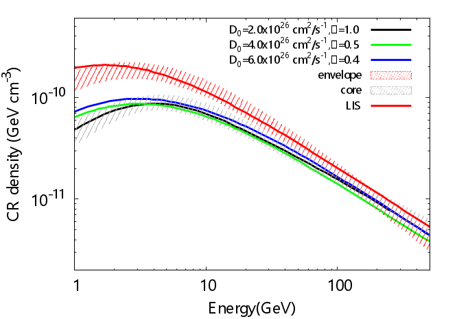 图二:Taurus和Perseus不同区域的宇宙线能谱:致密团块对应灰色斜线,弥散气体为 红色斜线,地球本地观测数据为红色实线。黑色、蓝色和绿色实线是不同扩散系数假设下计算所得的分子云团块内宇宙线能谱。