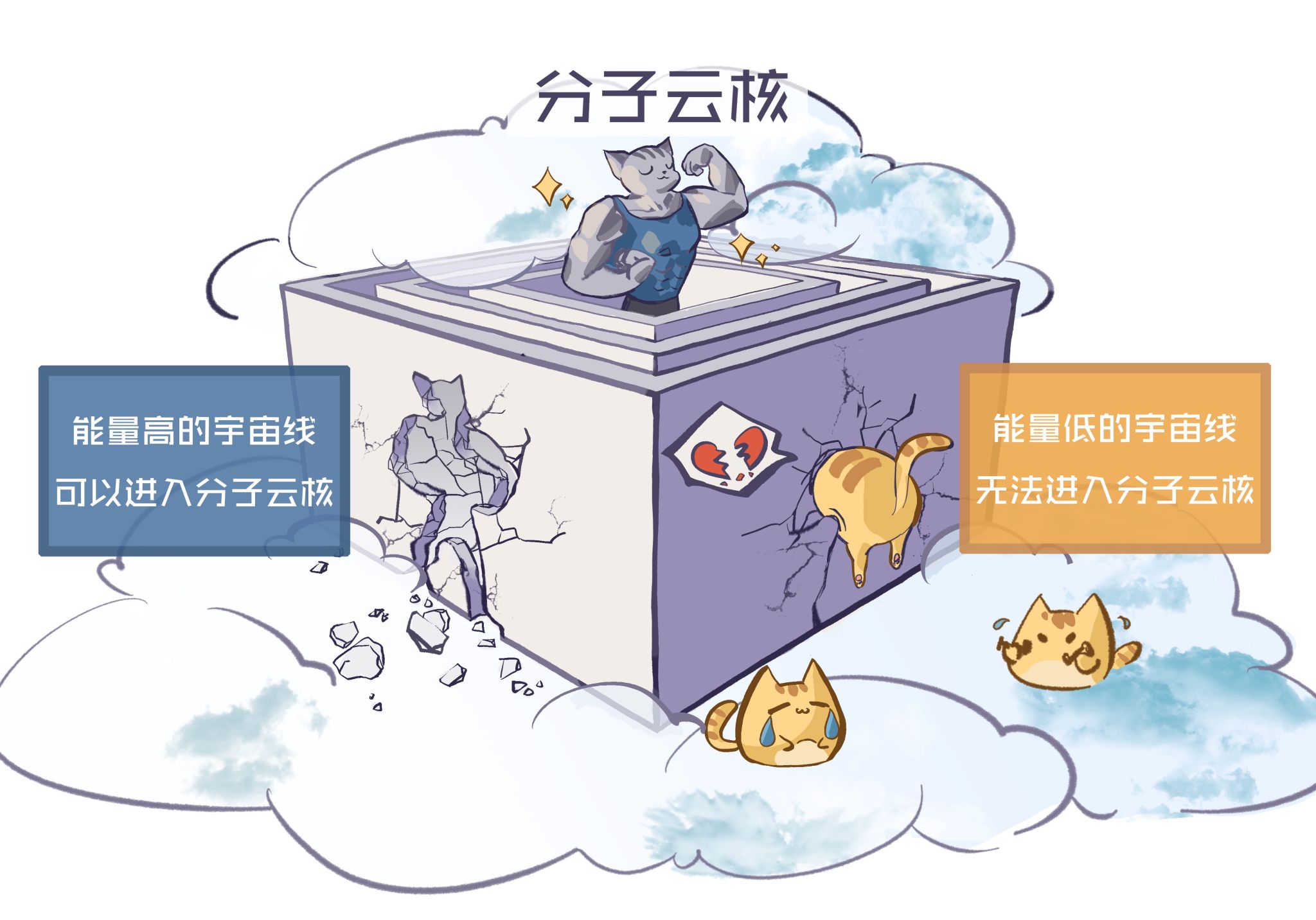 图三: 不同能量的宇宙线进入分子云致密核心的能力也不同,高能的可以轻松穿透,低能的大多被屏蔽在外(卡通示意图)。