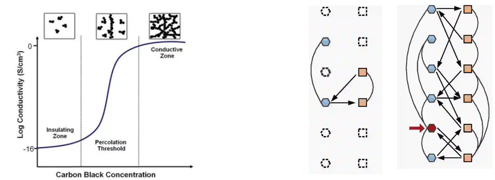 (左图是电路导通的渝渗模型,右图是学生思维神经网络的渝渗模型。它们都是一个复杂性网络。)