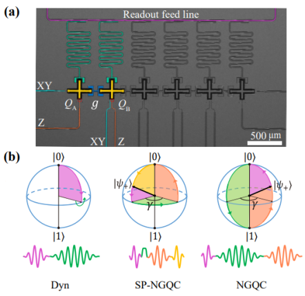 图1 (a)“夸父”6比特超导量子芯片电镜图,前两个相邻的比特被用于展示本文的实验。(b)传统动力学门方案(Dyn)、过去的非绝热几何相位门方案(NGQC)和本文实现的短路径非绝热几何相位门方案(SP-NGQC)的演化路径在参数空间的直观对比。