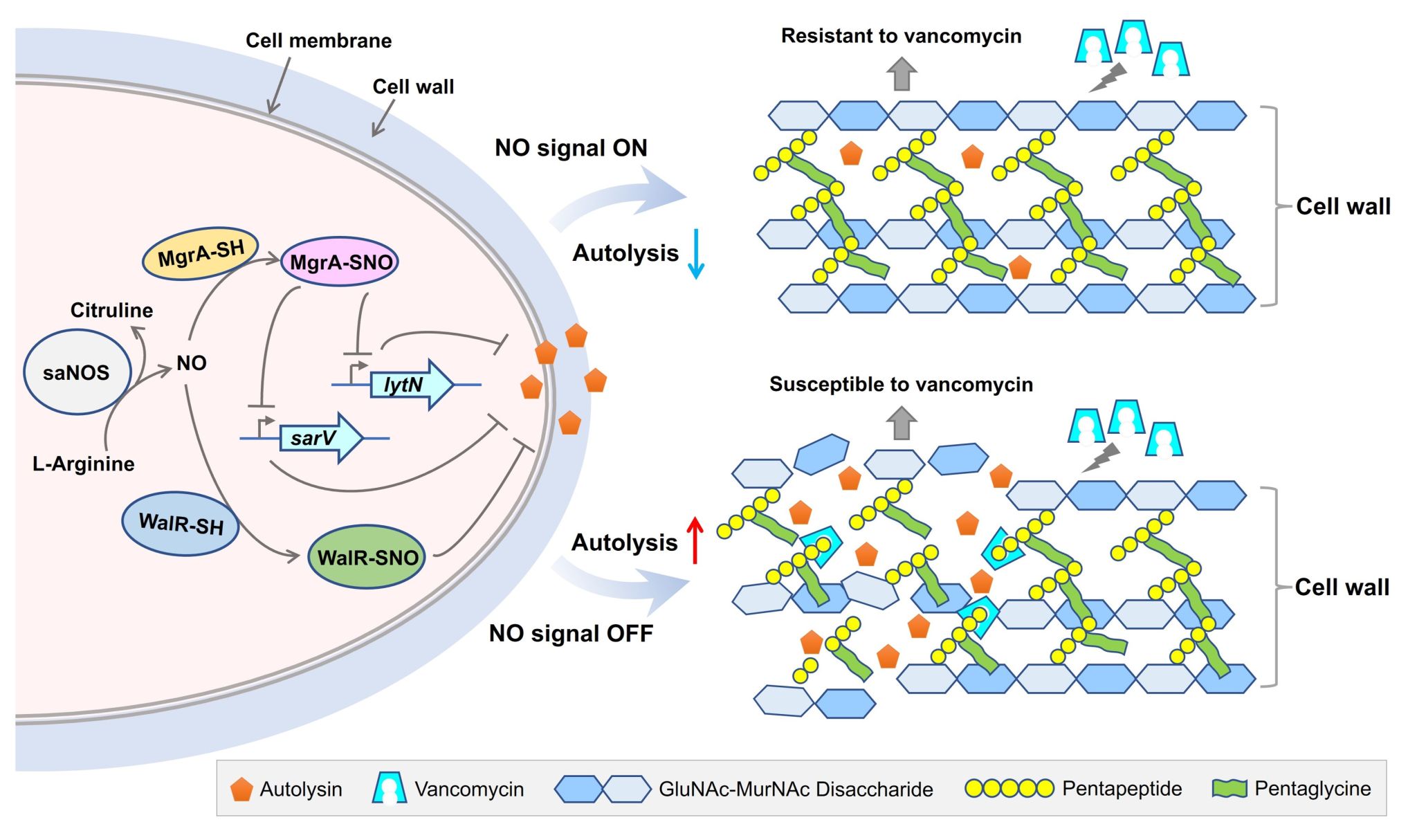 图1. NOS通过S-亚硝基化修饰介导万古霉素耐药性的分子机制。当存在内源NO时,MgrA和WalR发生S-亚硝基化修饰(SNO),促进对自溶相关靶基因的负调控功能,导致细胞的自溶活性下降,介导细胞壁厚度增加,进而促进金黄色葡萄球菌的万古霉素耐药性。
