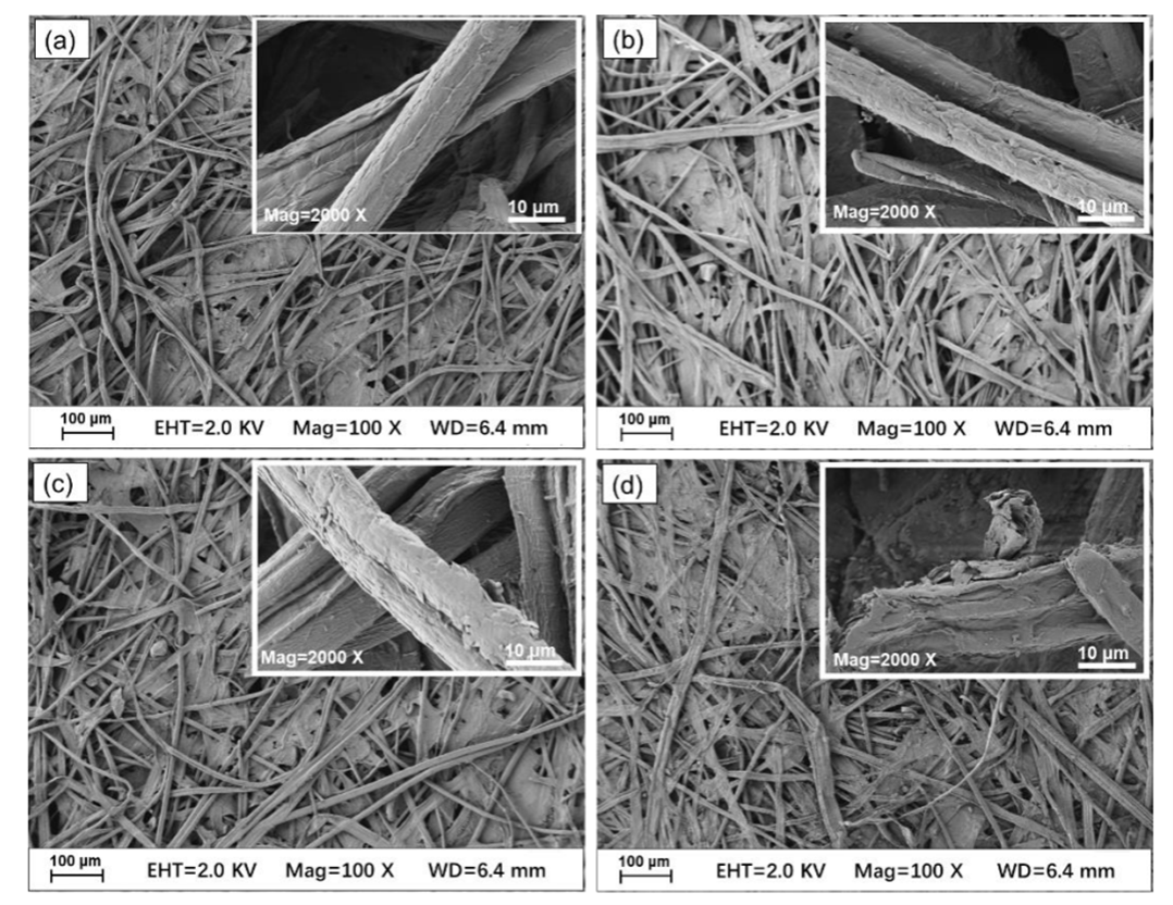 图三 不同竹纸的SEM图像. (a) untreated;(b) dry heat-90 d;(c) moist heat-24 d;(d) No.XF3