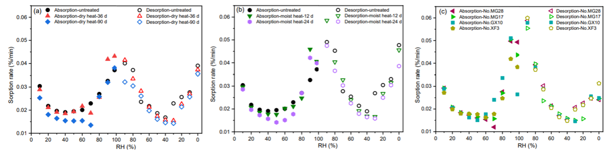 图一 未老化及不同老化模式下竹纸的吸湿与解吸速率.(a)干热老化;(b)湿热老化;(c)自然老化
