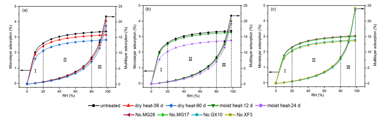 图二 未老化及不同老化模式下竹纸在等温吸附过程中单层和多层吸附的水含量. (a)干热老化;(b)湿热老化;(c)自然老化