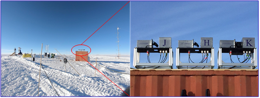 针对南极DOME A的极低温度、高海拔、低气压(昆仑站极夜情况下平均温度-60度,最低温度-86度,海拔4087米,气压为0.5个大气压)、电力困难等极端条件,王坚团队借助InGaAs探测器在J,H,Ks波段的探测优势,以及不需要深度制冷的特点,进行了光学,低噪声读出电子学,结构和电控,自动观测等方面针对性的设计,于2018年完成了面向南极观测的近红外天光背景测量仪(NISBM for Dome A),并在Ks波段设备上实现实时黑体定标技术以保证数据的可靠性。设备于2018年11月随“雪龙”号科考船前往南极,并于2019年1月23日在南极昆仑站安装成功并投入运行,如图1所示。