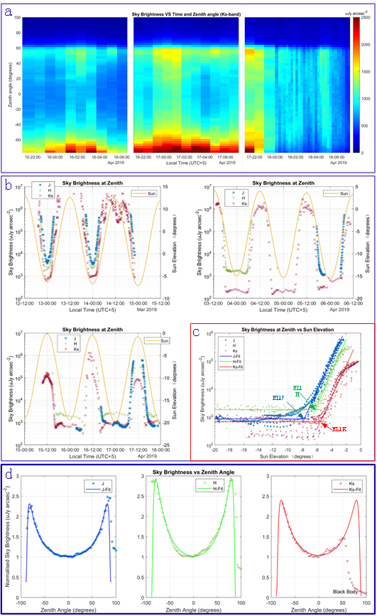 团队针对NISBMfor Dome A获得初步南极观测数据,进行了仔细细致的分析。分析结果如图2所示,a中展示了DOME A白昼到极夜过渡过程中,Ks波段在-80°~100°观测角度上原始天光背景强度的时域变化情况;b中分析了J,H,和Ks波段天顶角(90°)天光背景强度与太阳高度角随时间变化的关联性;c中解析了J,H,和Ks波段进入黑夜时太阳高度角的差异性,即:当太阳高度角降低到某个特定拐点后,该波段的天光背景强度将不再受太阳影响,J,H,和Ks的拐点分别为:EL1J=-7.8°,EL1H=-6.2°,EL1K=-5.5°;d中根据理论公式对J,H,和Ks波段观测数据进行了拟合,很好的符合了理论结果。