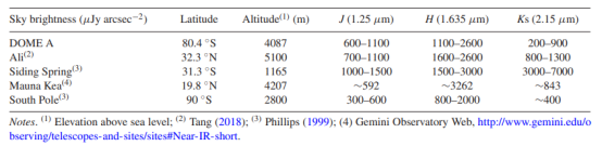 通过对天顶角数据的计算分析,南极DOME A在J,H,和Ks波段的天光背景强度分别为:600 ~ 1100μJy arc sec−2,1100 and 2600μJy arc sec−2,200~900μJy arc sec−2。对比低纬度高海拔地区的观测站(如表1所示),DOME A在Ks波段亮度明显降低,与南极点(SP)相当。这表明DOME A是进行Ks波段天文观测的绝佳地点。