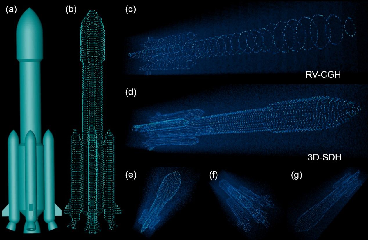 图2.3D-SDH和最先进的三维计算全息(RV-CGH)方法的投影效果比较。