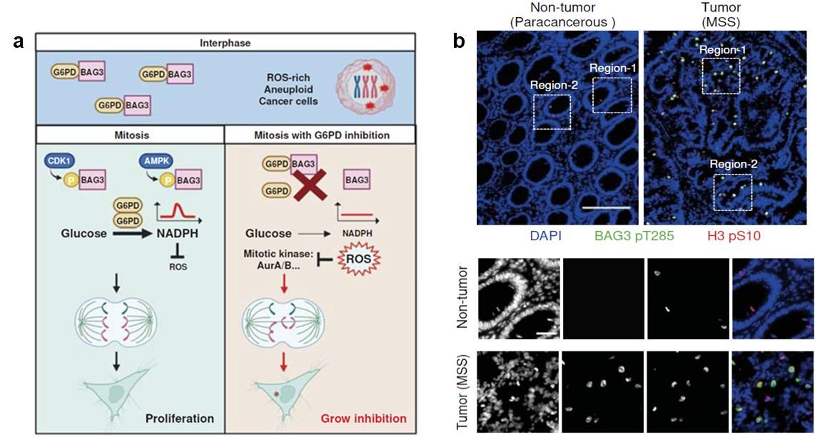 该研究团队利用代谢物的活细胞探针、细胞和动物模型并结合临床队列样本的分析,深入地探究了非整倍体肿瘤细胞在分裂期氧化还原动态变化和调控机制,发现了核心代谢物NADPH在细胞周期的分裂期中的变化规律和重要意义,证明该代谢调控能够确保非整倍体肿瘤细胞染色体准确分离和维持基因组完整性。研究完整地揭示了NADPH在分裂期的上游调控激酶CDK1/AMPK通过磷酸化伴侣分子BAG3-T285释放并激活代谢酶G6PD,以及下游参与染色体分裂调控的代谢和周期信号(图左),并且发现BAG3-T285磷酸化在微卫星稳定型(多数为非整倍体)结肠癌样本中比例高(图右),且与不良预后相关。从而为通过干预代谢通路选择性抑制非整倍体肿瘤提供了新的标记物和治疗思路。