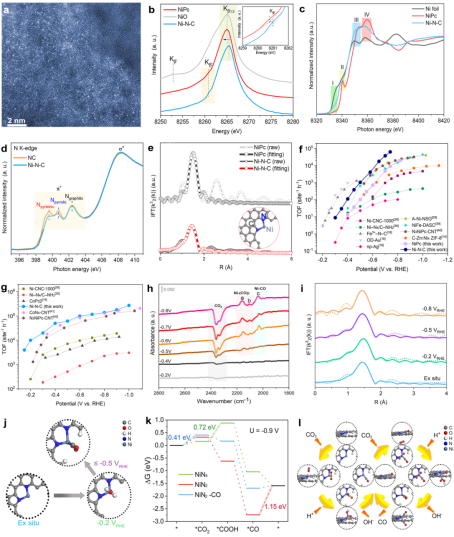 在研究中,该团队设计合成了一种具备二氮配位(吡啶与吡咯氮)的分子型Ni单位点(Ni-N-C)催化剂,并将其用于中性和碱性介质中的CO2电还原反应。同步辐射X射线吸收谱、发射谱等揭示了催化剂中Ni位点的局域配位结构。电化学测试结果表明Ni-N-C催化剂在中性(H型电解池)和碱性(扩散电解池GDE)电解液中都可以实现非常高的电化学性能。尤其是碱性中,催化剂能够在-0.15VRHE下实现20.1 mA cmgeo-2的CO分电流密度,在-0.15~-0.9VRHE电位区间保持90%以上的CO法拉第效率,在-1.0 VRHE下实现超过274000 site-1 h-1的TOF值,超过大多数已报道的催化剂。