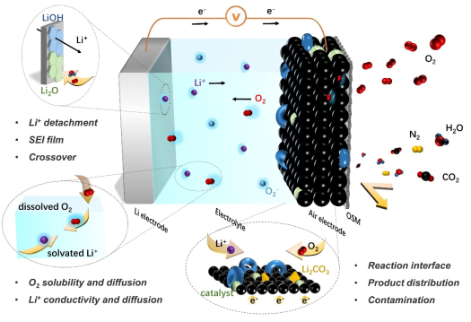 图2 非水系锂-空气电池的关键传质问题与解决策略