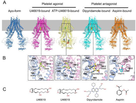 ABCC4在无配基和底物结合时呈现向内开口(inward-facing)构象,此时两个核苷酸结合结构域(NBD)相互分离,两个跨膜结构域(TMD)形成一个朝向细胞质液开放的兼容性底物结合口袋(图一)。该结合口袋由中心的疏水腔和外围的极性氨基酸组成,其中疏水腔负责稳定底物的疏水核心,而极性氨基酸则与底物的极性基团形成氢键相互作用。ATP结合使得两个NBD发生二聚化,带动两个TMD相互靠近,ABCC4由向内开口构象转变为对细胞质液和细胞外均封闭的向外开口(outward-facing occluded)构象(图一)。通过结构分析结合生化实验,我们证明血小板激活剂TXA2和拮抗剂阿司匹林均是ABCC4的底物,同时发现双嘧达莫是ABCC4的强竞争性抑制剂,进而阐明了其与阿司匹林临床联用的分子机制。该研究不仅揭示了ABCC4识别广谱底物的分子机制,而且为理性设计靶向ABCC4的血小板拮抗剂以及预防心血管疾病的药物奠定了结构基础。
