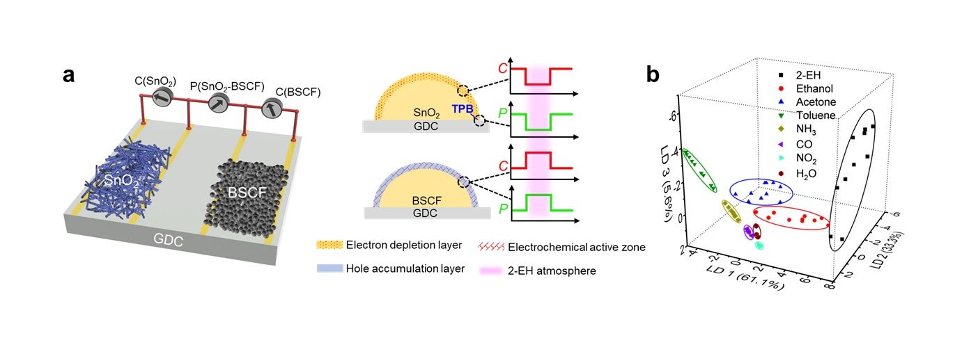 这种兼具探测和识别功能的多变量气体传感器简单、高效、成本低,可适用于不同半导体材料电极和固体电解质基底,工作温度范围宽,并可进一步拓展获得更高维度的响应,为复杂环境中气体的高灵敏和准确探测提供了新思路。