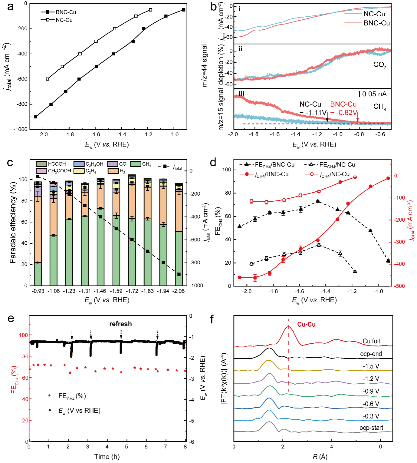 电催化测试结果表明,与Cu-N4结构相比,引入硼掺杂的Cu-BxNy结构对甲烷产物表现出优异的性能,在-1.46伏(相对标准氢电极)时显示出73%的峰值甲烷法拉第效率,在-1.94伏(相对标准氢电极)时显示了-462毫安每平方厘米的最大甲烷偏电流密度。电化学微分质谱测试也表明引入硼掺杂的Cu-BxNy结构具有更高的本征活性。流动池中的稳定性测试及铜元素K边原位X射线吸收谱测试结果共同证明了所合成的硼-氮共配位的铜单原子催化剂的结构稳定性。