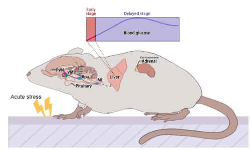 应激反应是动物在处理威胁时作出的本能反应,其中包括血糖快速上升来应对潜在的危险。经典的理论认为,应激血糖的产生是通过经典的下丘脑-垂体-肾上腺轴或者自主神经-肾上腺轴来刺激应激激素响应能量供应,但这两条通路均需要肾上腺介导,且在时间上有明显的延迟,不符合应激过程快速释放血糖的生理需求。