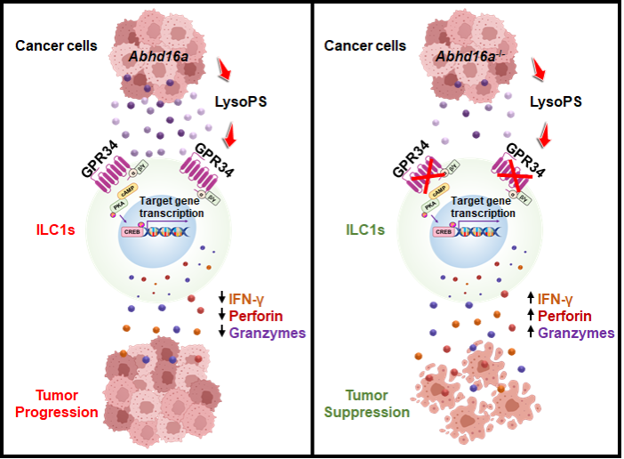 接下来,研究人员探究了GPR34调控ILC1s介导的抗肿瘤免疫的机制。通过质谱检测,发现GPR34配体LysoPS在肿瘤间质液积累。体外实验表明LysoPS以GPR34依赖的方式通过cAMP-PKA-CREB途径抑制ILC1s的活化。敲低肿瘤细胞上LysoPS合成酶ABHD16A的表达可以降低肿瘤间质液中LysoPS的水平并抑制了肿瘤的生长。此外,抑制肿瘤中LysoPS的产生可增加肿瘤中ILC1s的数量、比例以及抗肿瘤活性。这些结果表明,肿瘤来源的LysoPS通过GPR34抑制ILC1s介导的肿瘤免疫从而促进肿瘤生长。