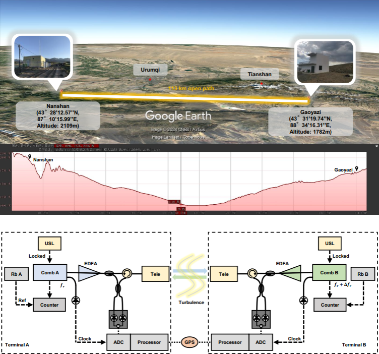 在本工作中,研究团队开发了一种新的双基站开放大气双光梳光谱测量方案。相比于传统单基站方案,该方案无需在测量远端放置反射器,光只需要经过待测路径一次即可完成测量,从而极大地减小了链路损耗,因此更适用于远距离、大尺度的测量。利用该方案,研究团队在乌鲁木齐成功测量得到113公里水平开放大气中水汽和二氧化碳的强度谱和相位谱,该距离比国际上最远的测量距离高了约一个数量级。该工作创新性地融合了潘建伟、张强等前期发展的高精度自由空间时间频率传递技术[Nature 610, 661 (2022)],频率准确度达到了10kHz,并通过自主研发的高精度反演算法,实现的二氧化碳反演精度在36分钟内小于0.6ppm。
