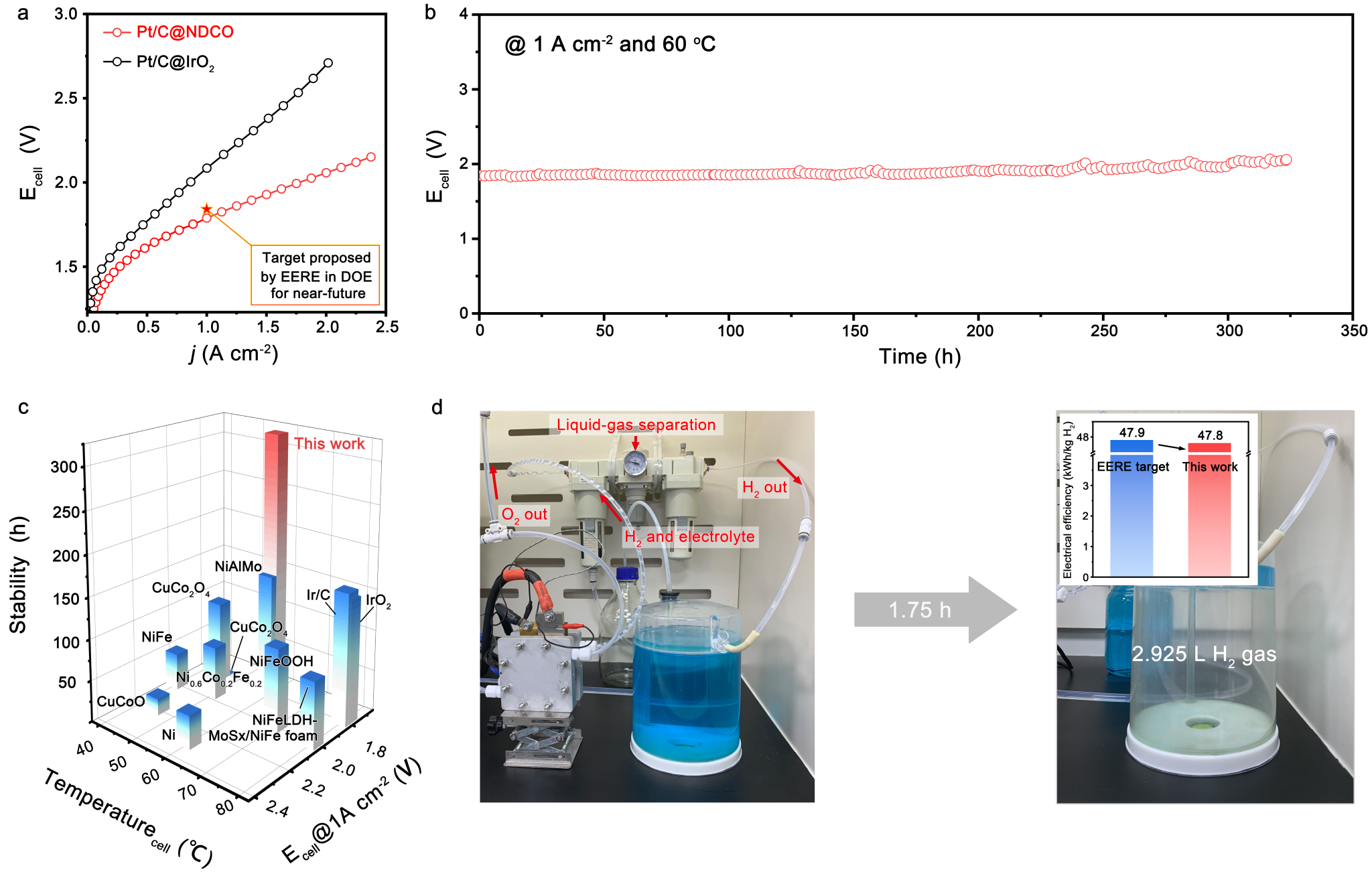 在实际的碱性膜电解槽中,该设计的催化剂作为膜电极组件的阳极催化剂,电解槽在1Acm-2电流密度为1.78V,并稳定地运行300小时以上。电解槽在1Acm-2的电流密度运行1.75小时后,共产生2.925升氢气,对应的电耗为47.8度电每公斤氢气(图2)。