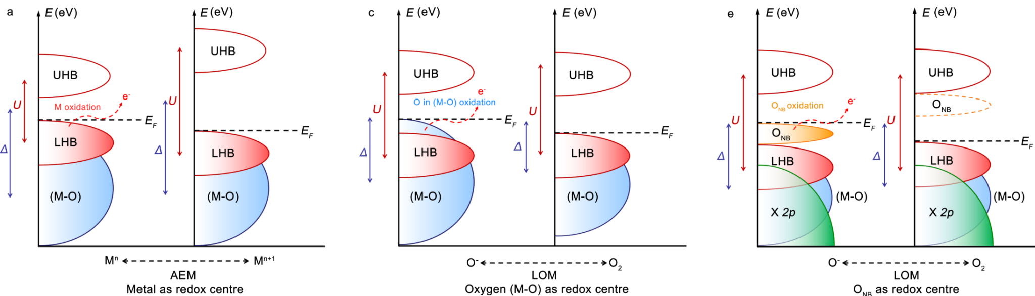 在传统的吸附演化机理中,电子从填充的下哈伯德带(LHB)给出。而将氧带推向费米能级,能触发晶格氧机制,此时氧作为氧化还原中心,电子从“金属-氧”键带给出,从而导致“金属-氧”键顺序降低,致使结构不稳定。该工作创新性地构建ONB态,取代“金属-氧”的成键带作为电子供体,使得其键序得以保持,保证结构稳定性。同时,小电负性的氮取代氧位点,可以将LHB降低到“金属-氧”键带以下,触发晶格氧路径(图1)。