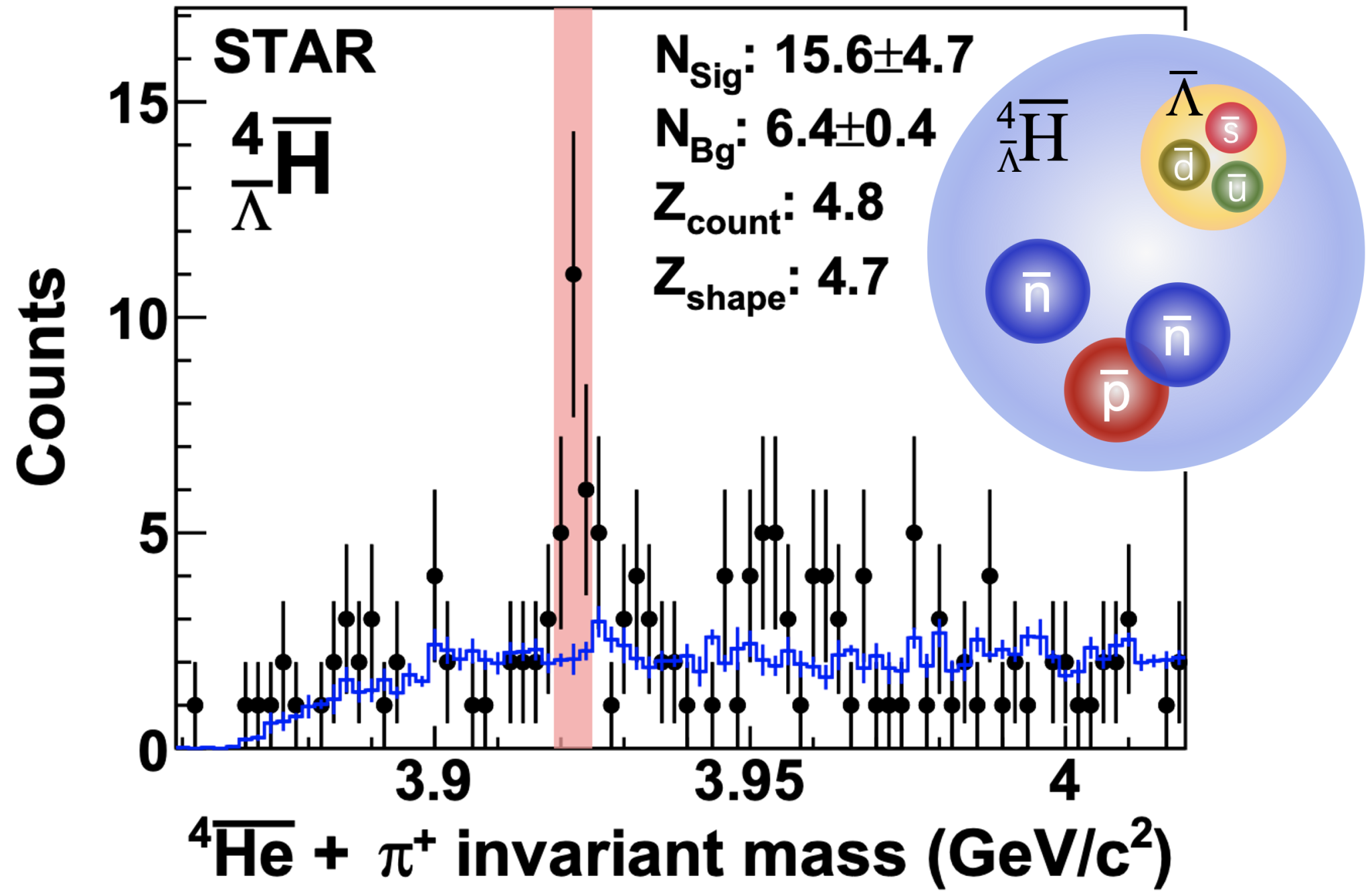 反物质和普通物质的不对称性是现代物理学的一个基本问题。我们生活的世界和现今的宇宙中为何绝大多数的物质都是正物质?这仍然是一个谜。1931年安德森正电子的发现证实了狄拉克方程反物质的猜想。此后科学家们相继发现了反质子、反中子,反氘核等等。越重结构越复杂的反物质,在自然界中的产率就越低,且呈指数下降,每增加一个反核子(质量数A+1),其产率就下降约1000倍,这导致在实验上发现发物质极其困难。人们猜想在宇宙“大爆炸”的初期,极端高温高密度的条件下,可能存在与正物质等量的反物质,但由于绝大多数正物质与反物质发生湮灭,并且随着宇宙膨胀温度降低,约百亿分之一的正物质存活下来,演变为现今的世界。运行在美国布鲁克海文国家实验室的相对论重离子加速器RHIC可以将两束重原子核(例如金核)加速到每核子100GeV的能量,并使其对撞,从而可以在碰撞瞬间产生几万亿度的高温火球,被人们称为“小爆炸”,以此模拟宇宙“大爆炸”初期的环境,为发现反物质创造了良好的条件。