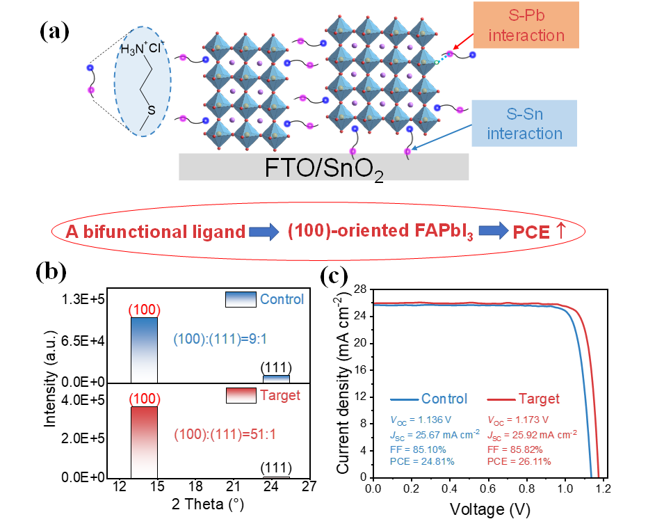 图注:(a) METEM分子通过与钙钛矿层和氧化锡层同时作用,诱导钙钛矿沿(100)晶面择优取向生长示意图。(b)METEAM掺杂前(control)、后(target)的钙钛矿薄膜(100)和(111)晶面强度比值。(c)METEAM掺杂前后钙钛矿太阳能电池J-V曲线。
