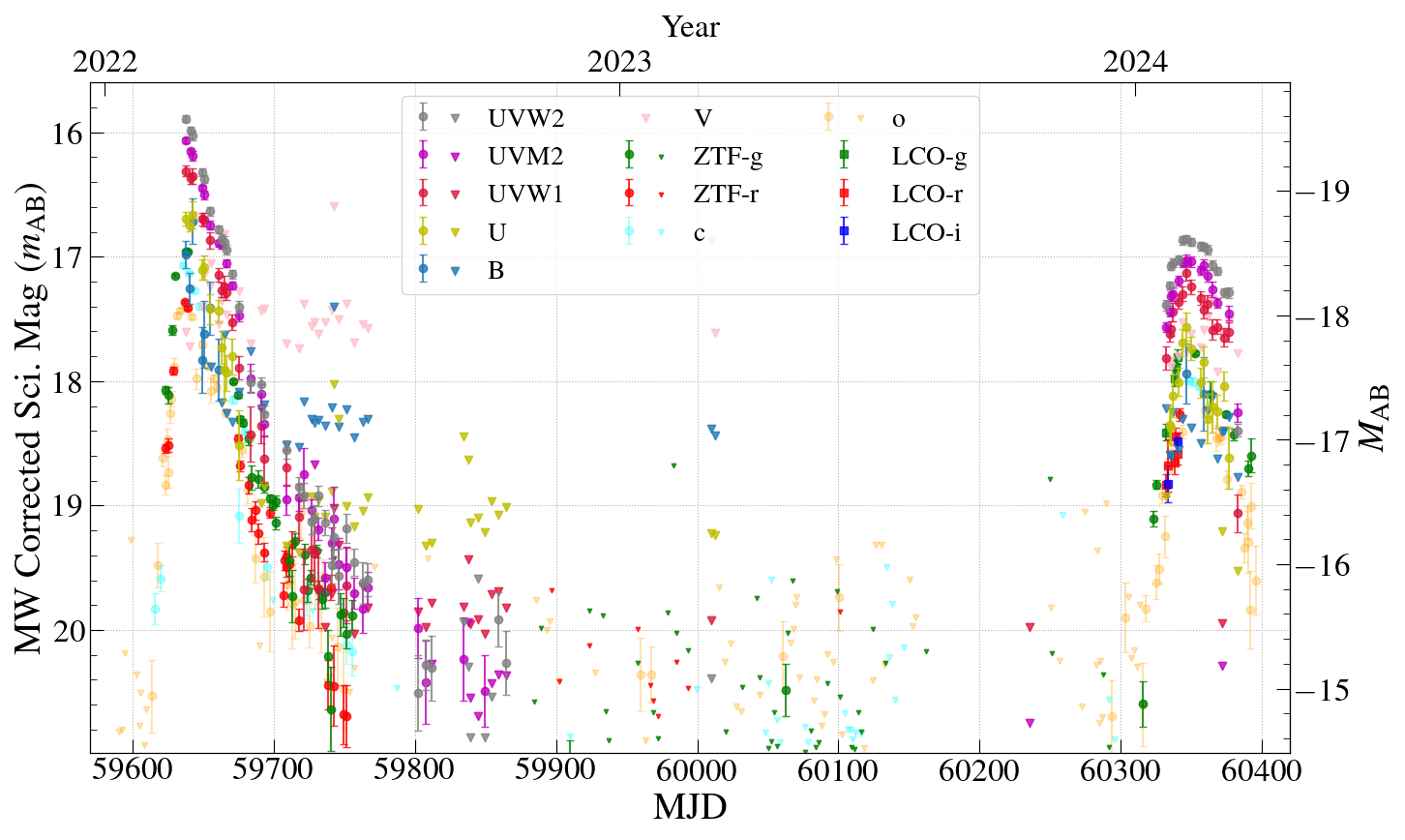 图1:紫外与光学多波段的光变曲线,倒三角表示探测的上限。2022年,第一次耀发出现,随后消散以至不可辨认;2年之后,同一位置再次出现相似的耀发。