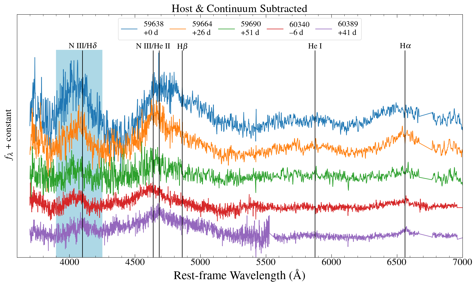 图2:光谱的发射线轮廓。从上至下前三条光谱与后两条光谱分别于第一次、第二次耀发期间拍摄。涂蓝色的区域表示两次耀发中极其相似的NIII特征谱线。该谱线可通过电离恒星被瓦解后释放出的物质来产生,其重复出现表明TDE再次发生,而相似的轮廓和强度则暗示参与其中的很可能是同一颗恒星。