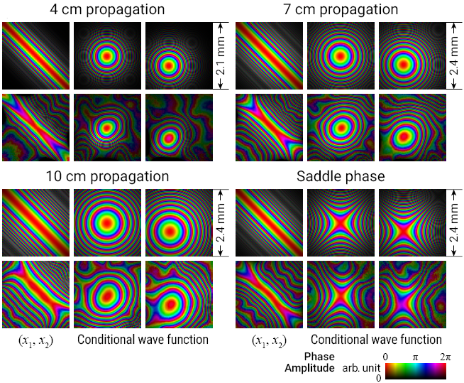 图2 实验结果图,展现了不同距离传播和相位调制后的波函数。各组数据第一列是双光子纵坐标取中心值时横坐标的联合波函数,第二列是中心点的条件波函数,第三列是中心右上方一点的条件波函数;第一行是理论值,第二行是实验重构结果。