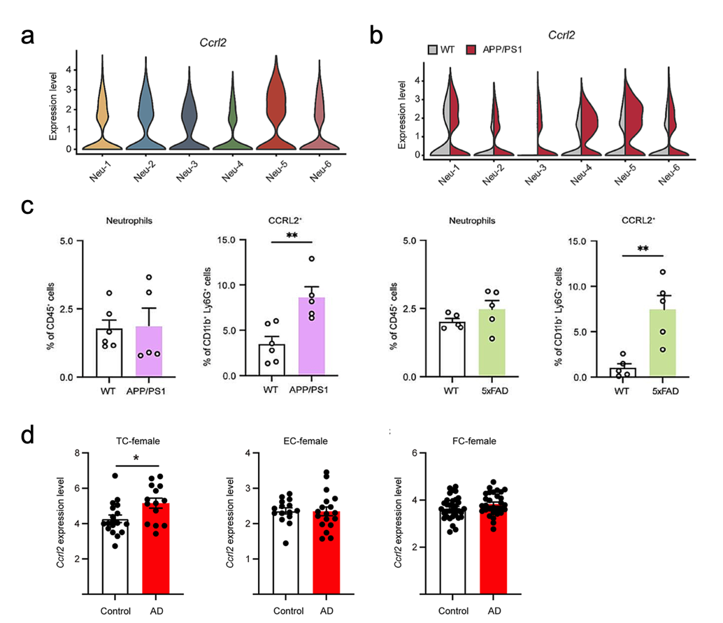 研究团队发现,Neu-5亚群在AD小鼠中显著富集,且这些细胞具有较低的颗粒度和成熟度。进一步的研究表明,该亚群中细胞因子介导的信号通路显著下调,而Ccrl2基因则特异性上调。通过流式细胞术和组织免疫荧光染色等多种技术手段,研究团队确认了CCRL2蛋白在AD小鼠大脑中的显著增加,并在ALZDATA数据库分析中观察到Ccrl2基因在女性AD病人颞叶皮层的特异性高表达。