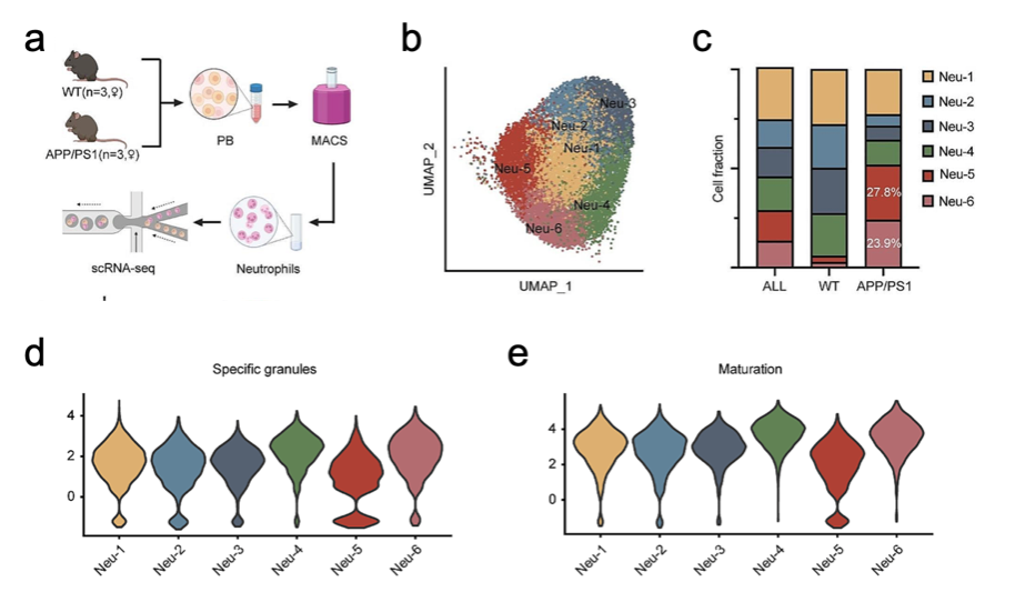 在此次研究中研究团队聚焦于外周血中性粒细胞在AD病理过程中的作用。他们通过创新的单细胞RNA测序技术,深入分析了AD小鼠外周血中性粒细胞的转录组图谱,成功揭示了中性粒细胞的异质性,并首次发现了与AD进展紧密相关的Neu-5中性粒细胞亚群。