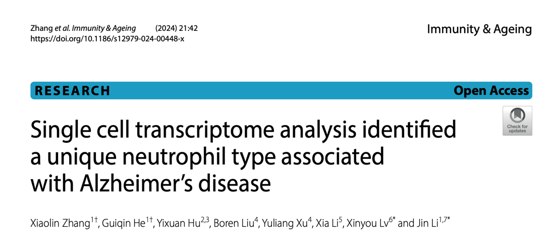 6月25日,乐鱼官网首页入口心理学系吕心游研究员联合公共卫生研究院李金副研究员,在《Immunity & Ageing》杂志上发表了题为“Single cell transcriptome analysis identified a unique neutrophil type associated with Alzheimer’s disease”的论文,绘制了AD小鼠外周血中性粒细胞的转录组图谱,揭示了AD外周血中性粒细胞的异质性,并发现与AD进展紧密相关的细胞亚群。