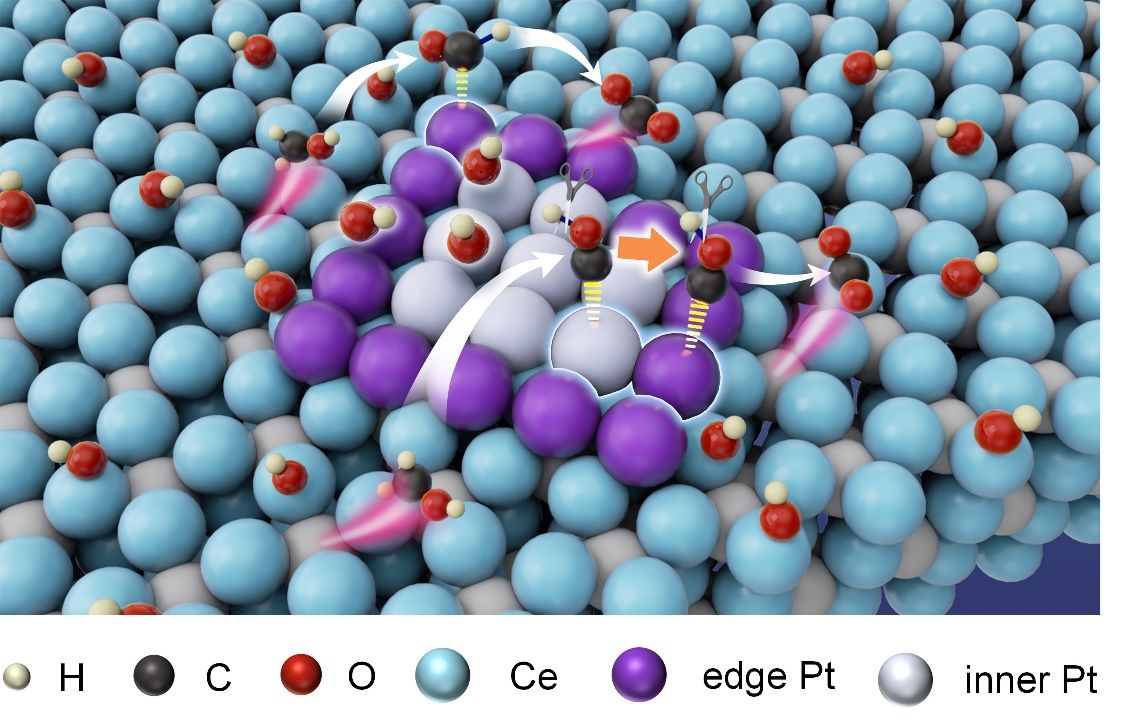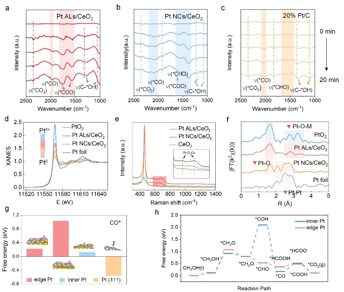 研究团队理性构筑了一种外延生长于CeO2表面的小尺寸原子层Pt催化剂(Pt ALs/CeO2),并利用发展的同步辐射原位X射线吸收谱技术,证实了Pt原子层金属与CeO2载体之间存在较强的金属-载体间电荷迁移相互作用(EMSI)。同时,阐明了催化剂中所构建的最大化的Pt-O-Ce位点,通过EMSI改变活性位点的表面吸附选择性和单元结构稳定性,有效地提升了电催化MOR的活性和稳定性。此外,研究团队根据活性位点与其相邻亲氧位点之间的距离,创新性地将Pt原子层分为边缘和内部Pt-O-Ce活性位点。结合同步辐射原位红外光谱技术进行实时监测和理论计算,深入研究了内部和边缘Pt-O-Ce活性位点分别诱导产生CO路径和非CO路径。