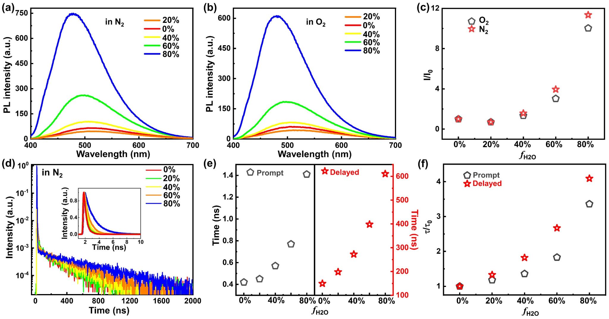 研究团队首先分析了目标材料DCzBF2在N2气氛和O2气氛下聚集效应对TADF的调控。研究发现无论在N2气氛还是在O2气氛下,DCzBF2都表现出明显聚集增强发光的效应。同时,发现在N2气氛中DCzBF2的即时荧光和延迟荧光的相对比例随着聚集效应的增强始终保持不变。