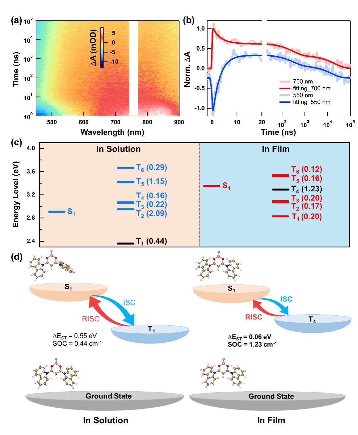 该研究展示了在TADF材料中整合AIE效应的可行性,并揭示了相应的工作机制。研究发现,随着聚集效应的增强,即时荧光和延迟荧光逐渐增强,但聚集效应不会改变单重态辐射速率和ISC速率之间的比值。此外,溶液和薄膜中超快光谱和理论计算研究进一步揭示增强SOC、减小DEST是聚集增强TADF的本质原因。