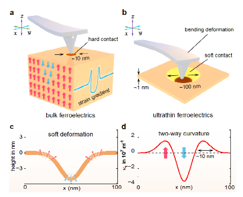 图1:二维材料中铁电极化力学双向调控策略演示。 (a-b)三维和二维铁电体中针尖诱导的挠曲电效应示意图。(c)二维铁电体中针尖诱导产生的拓展形变。(d)根据拓展形变计算所得的双向应变梯度空间分布。