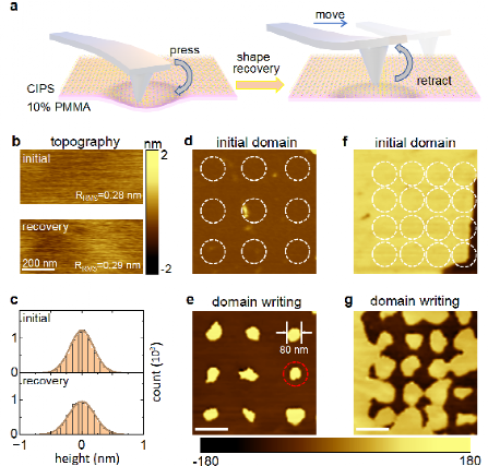 图2.二维CuInP2S6中可逆无损挠曲电调控的演示。(a)瞬态挠曲电操控技术示意图。样品在弹性限度内通过针尖压印产生形变,极化通过挠曲电效应进行切换。撤去针尖后,样品形貌恢复,而翻转的电极化得以保持。(b-c)瞬态挠曲电操控前后的样品形貌及统计。(d-g)铁电纳米畴的双向力学可控写入。