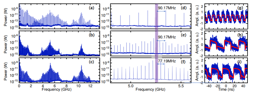 图2:三种典型的光力频率梳。(a-c)分别为三种频率梳状态的功率谱;(d-f)分别对应(a-c)中频率梳在5.3 GHz附近的功率谱线,展示重复频率分别为90.17 MHz、90.17/3MHz、 以及77.19/2 MHz。(g-i)分别为对应的时域振荡信号。