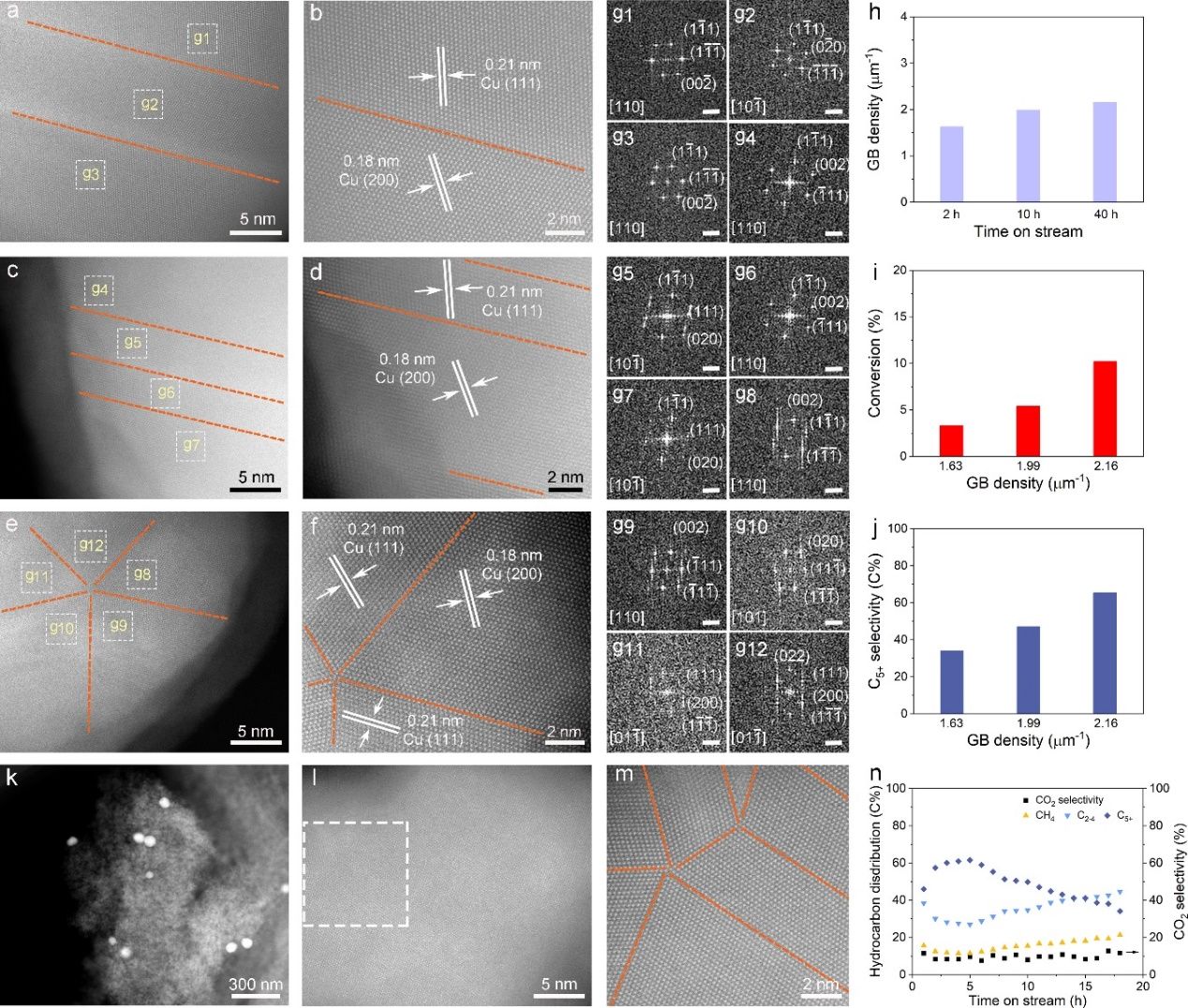 图2.催化剂的表征和分析图。(a和b)反应后2 h,(c和d)反应后10 h,和(e和f)反应后40 h的Cu/Y催化剂HAADF-STEM图像。(g1-g12)FET变换图像。(h-j)反应时间(h),CO转化率(i)和C5+选择性(j)和晶界密度的关系图。(k-m)GB Cu/SiO2的HAADF-STEM图像。(n)GB Cu/SiO2的催化性能图。