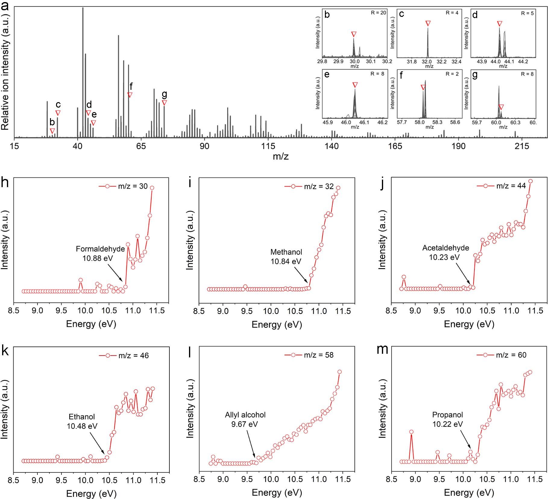 图3.活化后Cu/Y催化剂的同步辐射的真空紫外光电离质谱图。