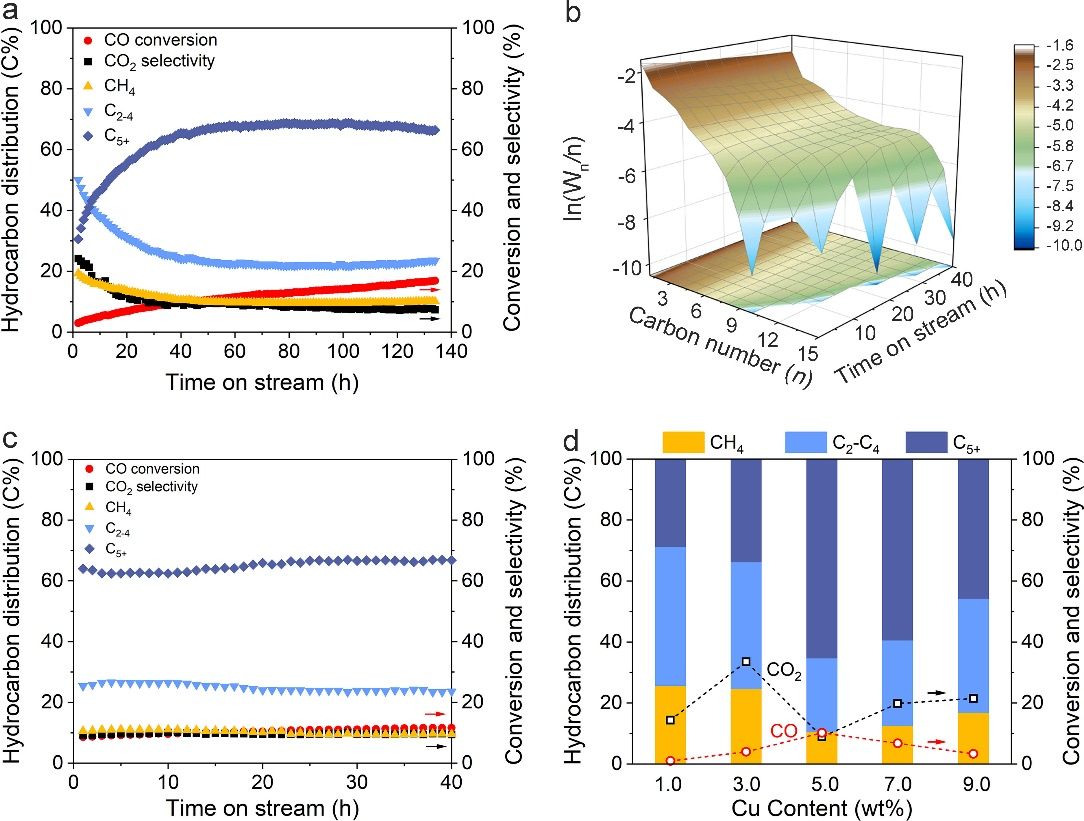 图1.催化性能图。(a)新鲜催化剂的催化性能随时间变化图。(b)新鲜催化剂的产物分布和碳数、反应时间关系图。(c)活化后催化剂的催化性能随时间变化图。d)不同Cu负载量催化剂的性能比较图。