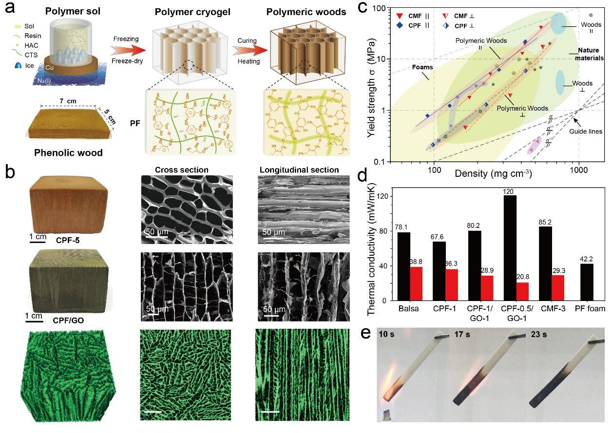 图2.酚醛树脂基仿生人工木材。(a)制备过程示意图。(b)微观结构。(c)轻质高强力学性能。(d-e)防火隔热性能。
