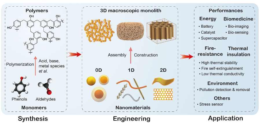 图1.酚醛聚合制备低维纳米复合材料、宏观块材等先进材料及其应用。