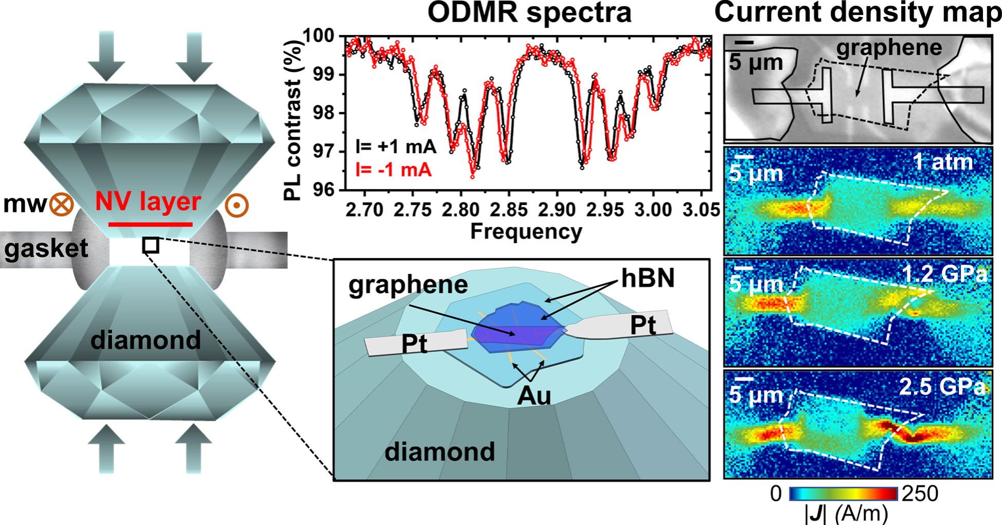 NV色心因其高磁场灵敏度及空间分辨率,已经在常压下实现集成电路与二维器件中的二维电流密度成像。此外,NV色心与金刚石对顶砧装置(DAC)相结合,可以在高压下实现高分辨率磁成像。基于此,这项工作进一步将NV色心与金刚石对顶砧装置(DAC)相结合,在高压下实现了二维电流密度的无损、高分辨率成像。利用金刚石近表面NV中心层映射的石墨烯中电流产生的二维矢量磁场,可重构石墨烯器件中的二维矢量电流密度。电流密度图像准确、清晰地再现了高压下被压缩石墨烯的复杂结构(如裂纹、孔洞的产生)和电流流动。此外,提取的高压下石墨烯器件中的压力空间分布图合理地解释了电流密度的不均匀性,如接触电阻的差异和厚度不均匀性等。