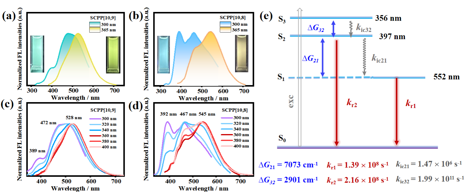 近日,研究团队基于前期碳纳米双环的研究工作(Angew. Chem. Int. Ed.2021, 60, 17368-17372;Nat. Commun.2022, 13, 3543),成功构建了两种对称性破缺的异质全苯撑碳纳米双环,SCPP[10,9]和SCPP[10,8](图1b),获得了来自高能激发态S2和最低激发态S1的反Kasha多重发射(图1d)。异质全苯撑碳纳米双环具有非同寻常的光物理现象,这些现象源于打破了原始中心对称结构的对称性。研究团队通过实验验证了SCPP[10,9]和SCPP[10,8]在溶液中既可从高能激发态S2发射又可从最低激发态S1发射,从而实现了激发依赖的多重发射(图2a-2d)。进一步的激发态理论计算表明由于第二激发单重态S2和第一激发单重态S1之间大的能量差,导致从S2态的辐射跃迁速率大于内转换速率,从而产生了高能发射(图2e)。