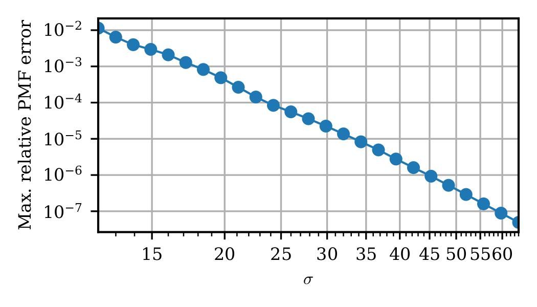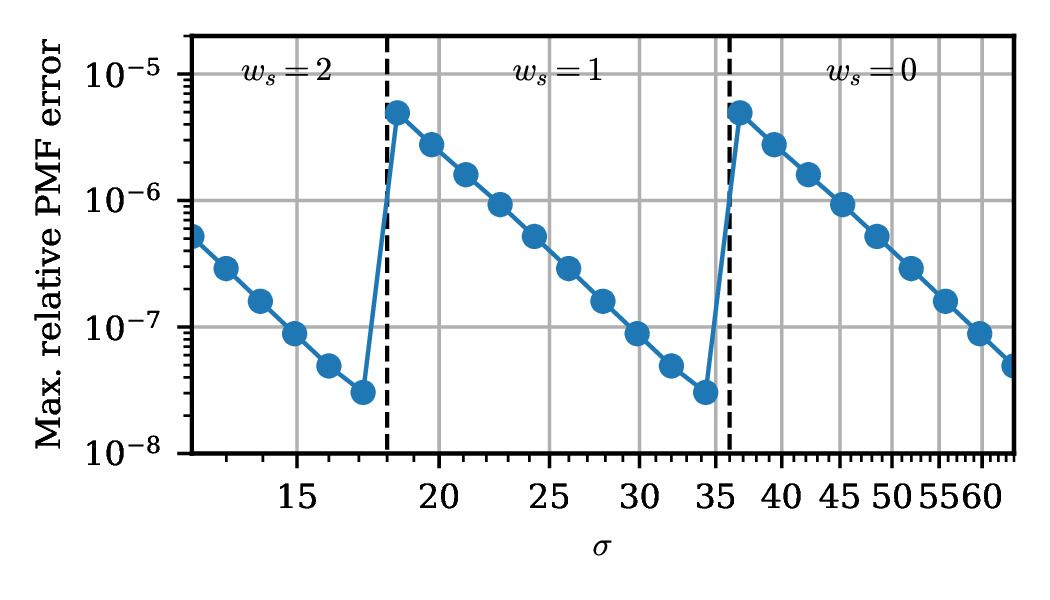 自从2000年工程师们尝试用硬件实现了Box-Muller算法后,关于硬件高斯随机数生成算法的研究就层出不穷。传统的适用于硬件的高斯随机数生成算法,包括Ziggurat法、Box-Muller法、Inversion法等,通常只针对σ=1的标准高斯分布,在硬件系统中使用时需要使用额外的乘法器和取整器,从而引入额外的硬件消耗和误差来源。此外,由传统方法设计的高斯随机数生成器的输出范围往往只能在参数设计完成后通过测试或理论分析得到,提高输出范围的方法不够直接。研究团队以一种相对较新的Piecewise-CLT算法作为基础,在对算法解析式的推导过程中,通过引入可变的σ值和预先确定的高斯随机数输出范围,获得了针对任意σ值和任意输出范围的高斯随机数生成器的设计方法,并以此设计出了理论输出范围达到±14σ的生成器(图1)。在尝试为算法引入可重配置性时,研究团队发现,如果直接重配置已有硬件架构的σ值,生成器的误差将随着σ值的降低而不断升高(图2),使其实用性大大降低。为了解决这一问题,该团队为算法引入名为缩放因子(scaling index)的参数,使得算法在针对不同σ值进行随机数生成时,会根据缩放因子的不同对相关数值进行缩放,从而得到相对稳定的误差曲线(图3),从而使得σ值的实时配置真正成为可能。