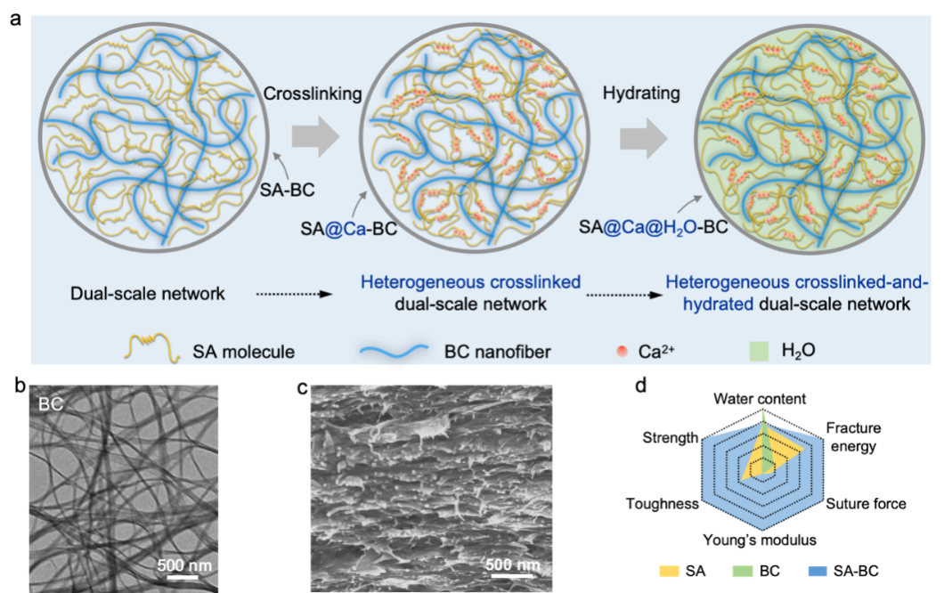 基于所提出的力学增强机制,研究团队首先使用海藻酸钠(SA)和细菌纤维素纳米纤维(BC)基元,按序结合钙离子交联和再水合步骤,制备出具有异质交联水合双尺度网络结构的多糖基纳米复合薄膜。系统性力学测试(包括单轴拉伸、缝线拉伸和原位撕裂拉伸等)结果表明,所提出的双尺度网络结构复合膜较单一尺度网络结构的薄膜在拉伸强度、韧性、杨氏模量、缝线拉力和断裂能等方面均具有显著优势(图1)。