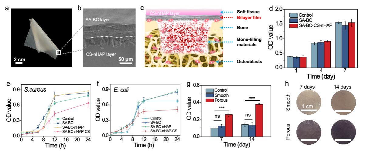 图2.a-c.通过功能化修饰而构筑出的双层膜应用于引导骨再生(a.双层膜光学图像,b.双层膜横截面扫描电镜图,c.双层膜应用于引导骨再生示意)。d-h.双层膜具有良好的生物学性能(d. 生物相容性,e-f.抑菌性,g-h. 体外诱导成骨性)。