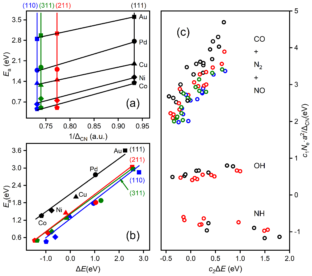 上述方程由于明确包含了催化剂的组分、结构和反应热信息,因此活化能对组分调制的结构项(图3a)和能量项(图3b)的依赖关系可用来拆分催化剂的几何效应和电子效应。同时活化能对这两项投影的大小可用来对催化结构敏感性进行分类。如图3c所示,活化能在前者较大的投影和系数意味着该分子(比如CO, NO, N2)的活化过程是一种结构敏感的反应,而如果在后者上(比如OH,NH)则意味着该反应为结构不敏感,这一结论主要是适合于小分子。较大的分子因其空间位阻效应显著,相应的投影不能用来判断反应的结构敏感性,但相应公式的预测能力依然表现出色。