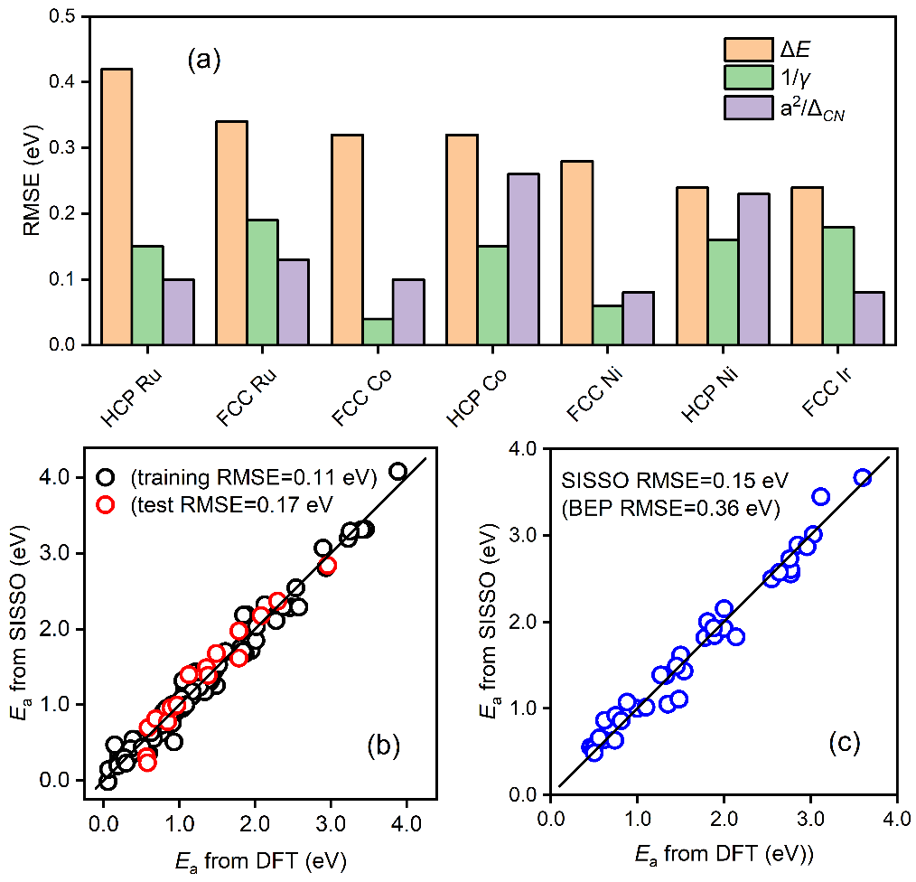 其中Ne为金属催化剂的价电子数,a为相应的晶格常数,ΔE为反应热,c1,c2和c0是对应的系数。在该二维模型中,第一项为结构项,正比于价电子数和晶格常数平方大小,反比于拓扑配位不饱和度,第二项为经典BEP关系中的反应能项。该模型能够准确预测分子断键能垒,并在具有不同对称性、键级和空间位阻等化学键的数据集上表现出良好的普适性(图2b和2c)。