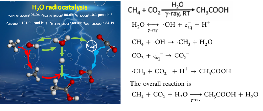 化石能源的过度使用造成了甲烷和二氧化碳等温室气体的大量排放,对社会的可持续发展产生威胁。将温室气体作为碳资源转化为具有高附加值化学品,是降低温室气体效应和实现碳资源循环利用的有效策略。乙酸是重要的化工中间体之一,目前工业上乙酸制备工艺主要依靠煤制甲醇法,该过程需要贵金属催化剂并且能耗极高。以CH4和CO2为原料直接制乙酸是原子经济比100%和同时转化两种主要温室气体到高值化学品的化学反应,但由于CH4和CO2的高稳定性,该反应非常具有挑战性,之前研究结果均未给出令人满意的活性和稳定性。大量文献结果表明在温和条件下CH4可以被羟基自由基(×OH)活化生成甲基自由基(×CH3),同时CO2可以被电子活化生成×CO2-自由基,可以预期×CH3和×CO2-易于耦合生成CH3COOH,而水在g射线辐照下能够形成eaq-, H3O+,×OH自由基以及少量的×H自由基。